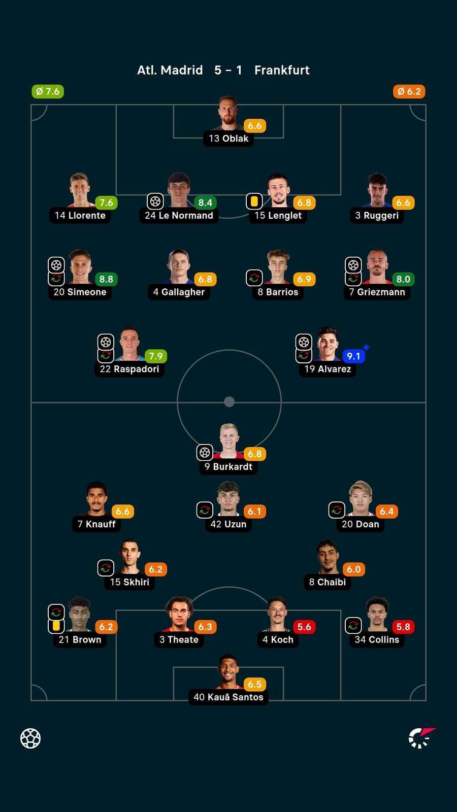 O Atlético de Madrid atropelou o Frankfurt por 5 a 1 nesta terça-feira (30), no Metropolitano, pela 2ª rodada da fase de liga da Champions. Raspadori, Le Normand, Griezmann, Simeone e Julián Álvarez fizeram os gols da implacável goleada. Burkardt descontou para o time visitante.