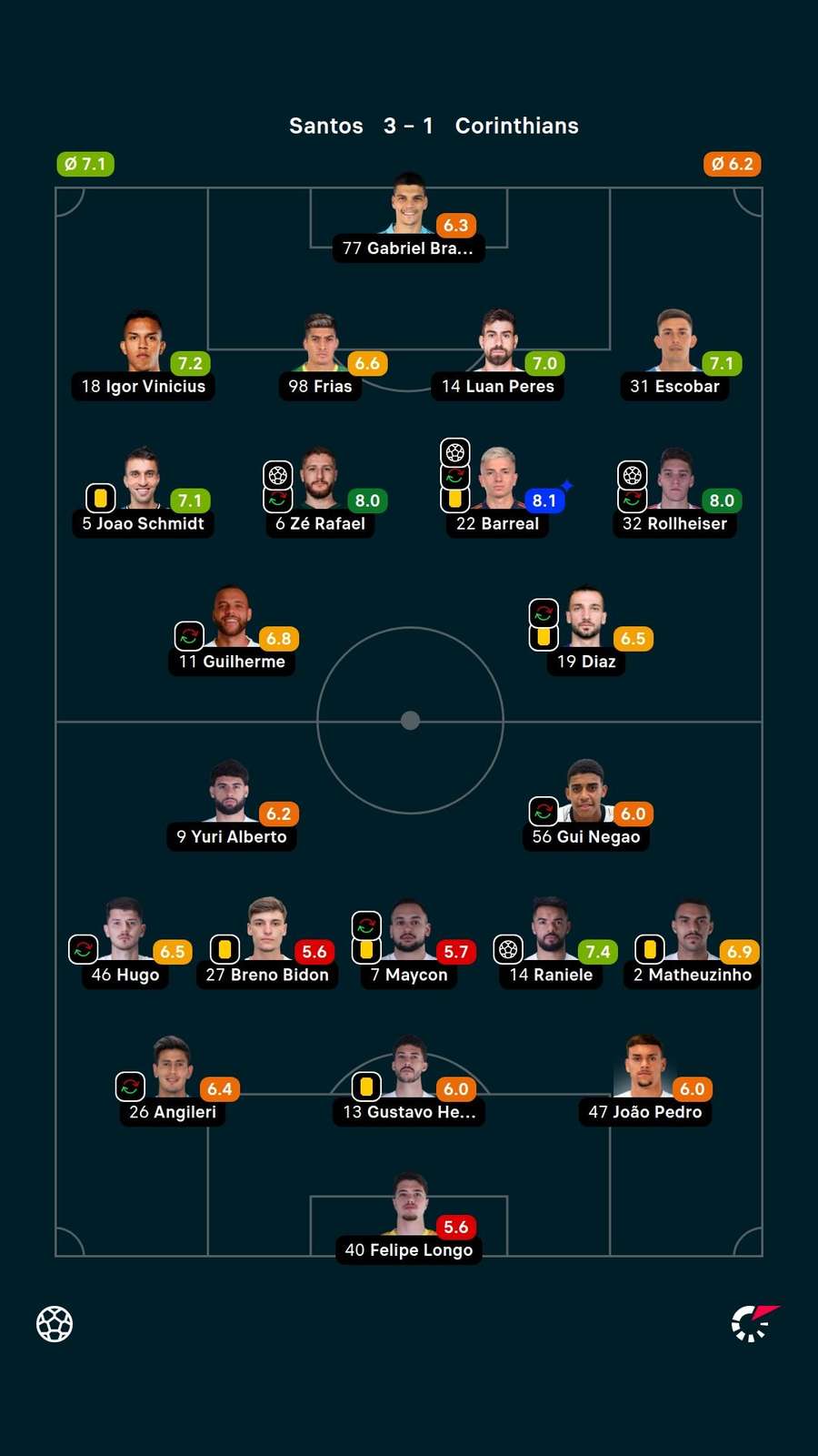 O Santos venceu o Corinthians por 3 a 1 nesta quarta-feira (15), na Vila Belmiro, pela 28ª rodada do Brasileirão. O Peixe fez sua melhor atuação no ano e já tinha a vitória assegurada no início do segundo tempo, com gols de Zé Rafael, Barreal e Rollheiser. Raniele descontou.